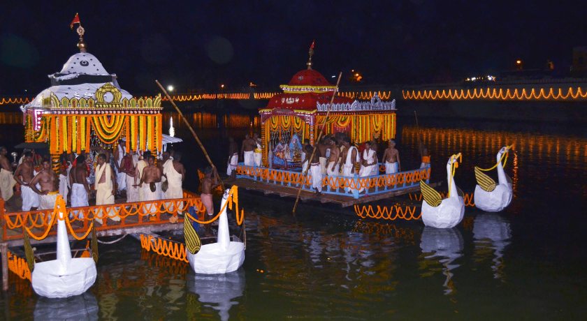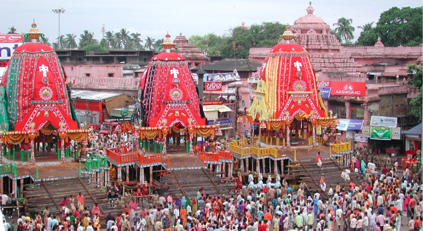 Ratha Jatra, the Festival of Chariots of Lord Jagannatha is celebrated every year at Puri, the temple town in Orissa, on the east coast of India. The presiding deities of the main temple, Sri Mandira, Lord Jagannatha, Lord Balabhadra and Goddess Subhadra, with the celestial wheel Sudarshana are taken out from the temple precincts.
