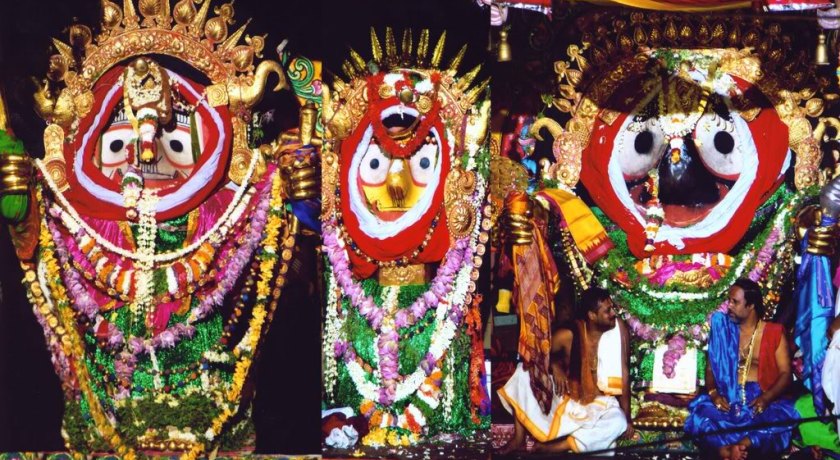 There, in their Garden House, adapa mandapa, also known as their place of birth, the deities stay for seven days. On the ninth day of the festival, Bahuda Jatra, the grand return journey takes place. On the way back they stop for a short while and partake of poda pitha, a type of cake made of rice, lentils, jaggery and coconut, offered by their aunt, mausima.